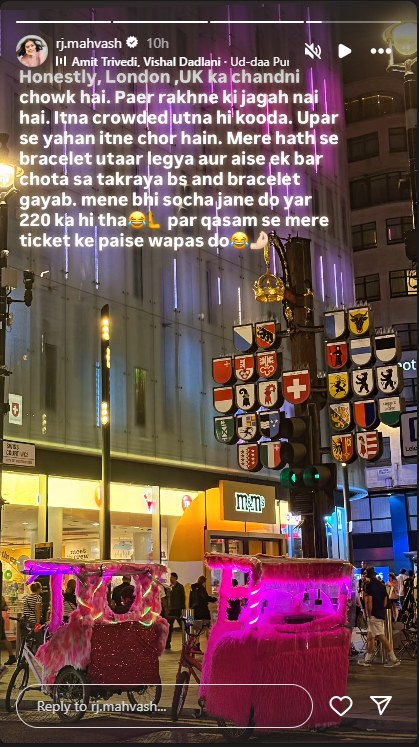 आरजे महवश (RJ Mahvash) ने अपनी इंस्टा पर स्टोरी शेयर करते हुए चोरी की घटना के बारे में बताया है. पोस्ट में शेयर करते हुए उन्होंने लिखा- ‘सच में, लंदन यूके का चांदनी चौक है. पैर रखने की जगह नहीं है. जितनी भीड़ है यहां उतना ही कूड़ा. ऊपर से यहां इतने चोर हैं. मेरे हाथ से ब्रेसलेट उतार ले गया और ऐसे एक बार छोटा सा टकराया बस और ब्रेसलेट गायब.मैंने भी सोचा जाने दो यार 220 का ही था. लेकिन कसम से मेरे टिकट के पैसे वापस दो’.