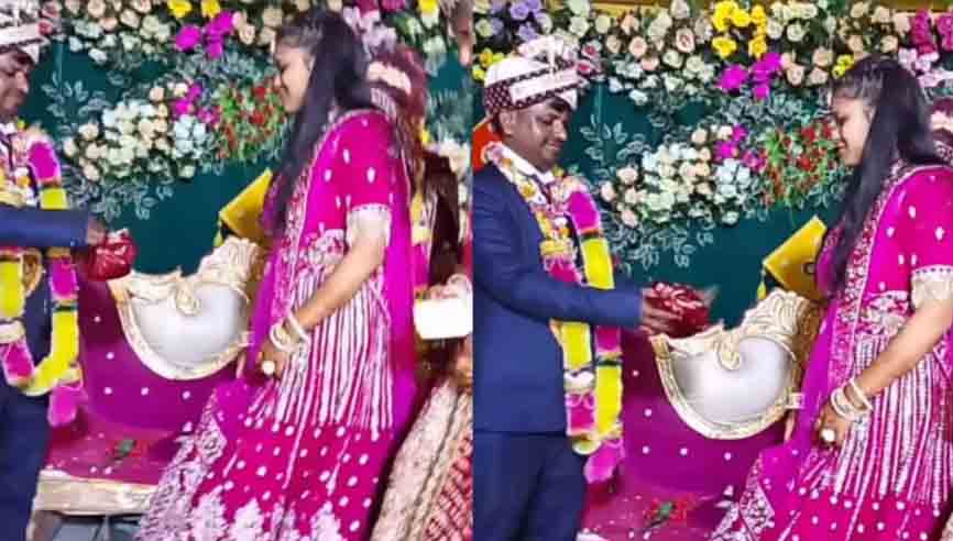 अभी जो वीडियो वायरल हो रहा है वो वरमाला के बाद का मालूम होता है। स्टेज पर दूल्हा और उसकी साली खड़े हैं। वीडियो में नजर आता है कि दूल्हे के पास एक गिफ्ट है और उसे खोलता दिखता है। उसकी साली भी अपने गिफ्ट को देखने के लिए काफी एक्साइटेड नजर आती है। पैकेट खोलते ही उसमें से एक मेंढक निकलता है और उसकी साली की तरफ उछलता है। अचानक मेंढक देख उसकी साली डर जाती है और तुरंत नीचे गिर जाती है।
