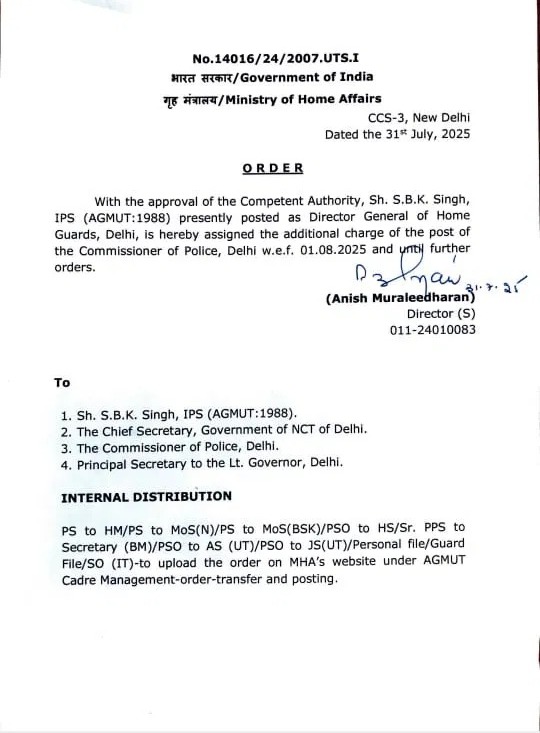 गृह मंत्रालय के आदेश के अनुसार, सक्षम प्राधिकारी की स्वीकृति से आईपीएस (एजीएमयूटी 1988) एसबीके सिंह को 01.08.2025 से अगले आदेश तक दिल्ली के पुलिस आयुक्त का अतिरिक्त प्रभार सौंपा गया है. वर्तमान में वे दिल्ली के होमगार्ड्स के महानिदेशक के पद पर कार्यरत हैं.
