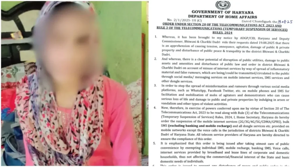 हरियाणा के भिवानी जिले में शिक्षिका हत्याकांड मामले में तूल पकड़ा हुआ है। इस बीच हरियाणा के गृह सचिव ने हरियाणा के भिवानी और चरखी दादरी जिलों के अधिकार क्षेत्र में वॉयस कॉल को छोड़कर मोबाइल इंटरनेट सेवाओं, बल्क एसएमएस और मोबाइल नेटवर्क पर उपलब्ध सभी डोंगल सेवाओं को निलंबित करने का आदेश दिया है। यह आदेश भिवानी और चरखी दादरी जिलों के अधिकार क्षेत्र में शांति और सार्वजनिक व्यवस्था में किसी भी प्रकार की गड़बड़ी को रोकने के लिए जारी किया गया है और 21 अगस्त की सुबह 11 बजे तक यह नियम लागू रहेगा।