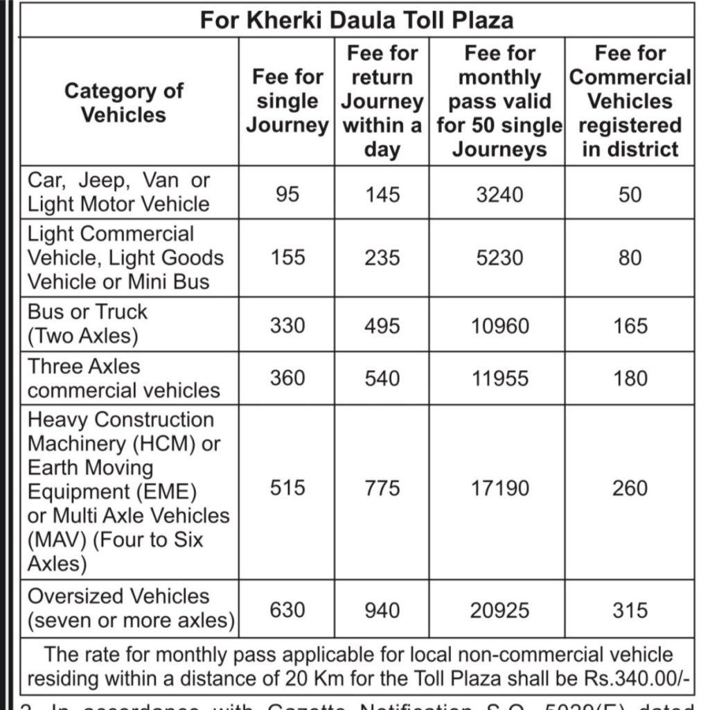 खेड़की दौला टोल प्लाजा पर कार, जीप, वैन या हल्के मोटर के लिए सिंगल ट्रिप- 95, डबल ट्रिप- 145, मासिक यानी 50 ट्रिप के लिए 3240 शुल्क है। हल्के व्यावसायिक, हल्के मालवाहक वाहनों के लिए सिंगल ट्रिप- 155, डबल ट्रिप- 235, मासिक यानी 50 ट्रिप के लिए 5230 शुल्क, बस या ट्रक (दो एक्सेल) के लिए सिंगल ट्रिप- 330, डबल ट्रिप- 495, मासिक यानी 50 ट्रिप के लिए 10960 शुल्क, तीन एक्सेलवाले व्यावसायिक वाहन के लिए सिंगल ट्रिप- 360, डबल ट्रिप- 540, मासिक यानी 50 ट्रिप के लिए 11955 शुल्क, भारी निर्माण मशीनरी के लिए सिंगल ट्रिप- 515, डबल ट्रिप- 775, मासिक यानी 50 ट्रिप के लिए 17190 शुल्क रहेगा और चार से ज्यादा एक्सेल वाले वाहनों के लिए सिंगल ट्रिप- 630, डबल ट्रिप- 940, मासिक यानी 50 ट्रिप पर 20925 शुल्क लगेगा।