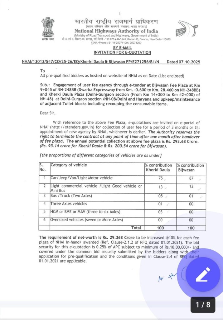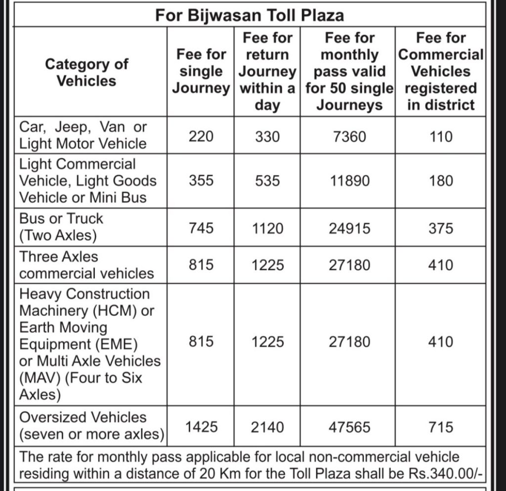 वहीं बिजवासन टोल प्लाजा (द्वारका एक्सप्रेसवे) पर कार, जीप, वैन या हल्के मोटर के लिए सिंगल ट्रिप- 220, डबल ट्रिप- 330, मासिक यानी 50 ट्रिप के लिए 3240 शुल्क है। हल्के व्यावसायिक, हल्के मालवाहक वाहनों के लिए सिंगल ट्रिप- 355, डबल ट्रिप- 335, मासिक यानी 50 ट्रिप के लिए 11890 शुल्क, बस या ट्रक (दो एक्सेल) के लिए सिंगल ट्रिप- 745, डबल ट्रिप- 1120, मासिक यानी 50 ट्रिप के लिए 24915 शुल्क, तीन एक्सेल वाले व्यावसायिक वाहन के लिए सिंगल ट्रिप- 815, डबल ट्रिप- 1225, मासिक यानी 50 ट्रिप के लिए 27180 शुल्क, भारी निर्माण मशीनरी के लिए सिंगल ट्रिप- 815, डबल ट्रिप- 1225, मासिक यानी 50 ट्रिप के लिए 27180 शुल्क रहेगा और चार से अधिक एक्सेल वाले वाहनों के लिए सिंगल ट्रिप- 1425, डबल ट्रिप- 2140, मासिक यानी 50 ट्रिप पर 47565 शुल्क लगेगा।